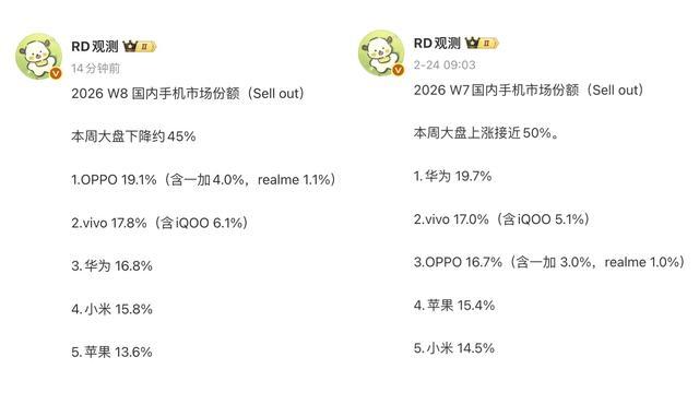 今天分享的是2026年W8国内手机排行榜,覆盖的时间为2.16-2.22(农历腊月29日到正月初六)最好的配资官网,因为本周涵盖了春节假期,所以搭整机激活量下降约为45%。和前几周榜单相比,本周的排行榜绝对是重新洗牌:华为仅排名第三,苹果跌到了第五名,OPPO以19.1%的份额遥遥领先,就问你惊不惊喜意不意外。