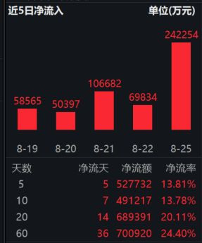 市场交投活跃背景下,资金纷纷涌入证券ETF(512880)来捕捉证券板块上涨空间。根据wind数据,截至8月25日,证券ETF(512880)连续5日净流入额超52亿元,当前规模超445亿元。