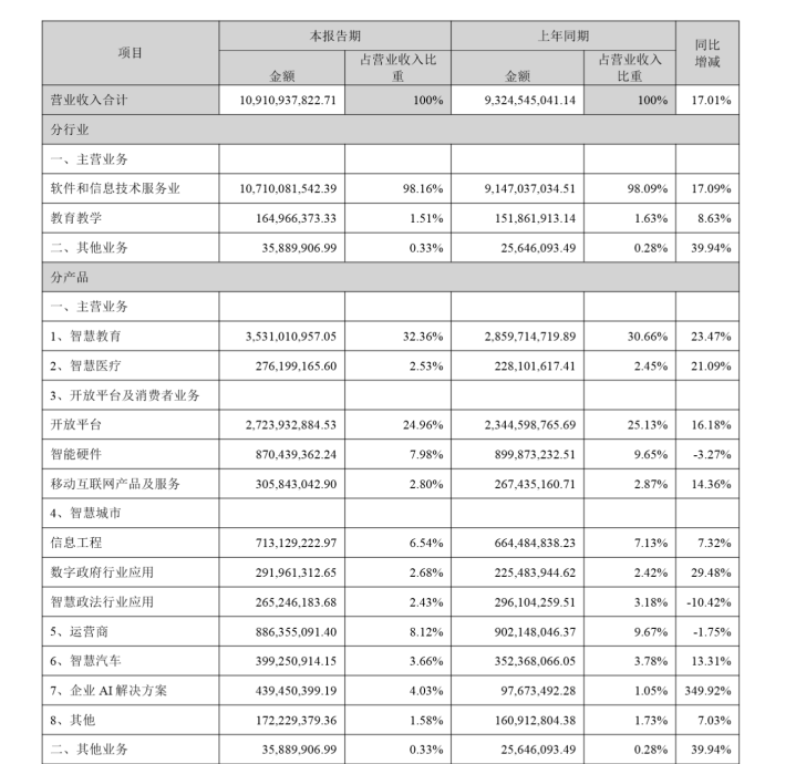 报告期内,科大讯飞智慧教育业务录得营收35.31亿元,同比增长23.47%,占营收比重由去年同期的30.66%提升至32.36%;智慧医疗营收为2.76亿元,同比增长21.09%;开放平台业务营收为27.24亿元,同比增长16.18%;在星火大模型加持下,企业AI解决方案业务实现营收4.39亿元,同比增幅达349.92%。智能硬件、智慧政法行业应用和运营商业务营收分别同比下滑3.27%、10.42%和1.75%。