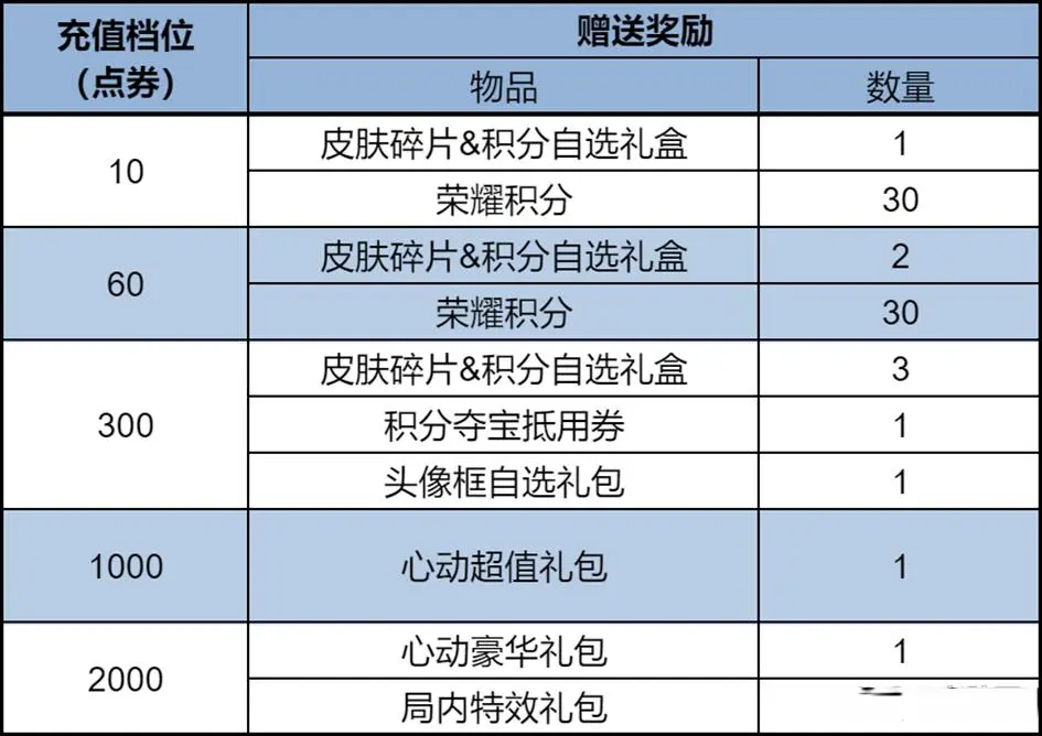 充值时间为1月22日-1月25日,共持续4天时间,充值最低10点券,最高2000点券。充值1000点券就能购买王昭君的FMVP皮肤了。还能获得相应的积分和皮肤碎片礼盒。