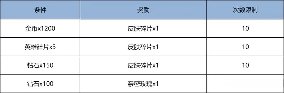两个活动一共可以最多获得共45个皮肤碎片。再加3个就能兑换鲁班七号的新皮肤,一直没用的金币钻石和英雄碎片也终于有用武之地。具体的兑换条件和奖励和限制次数如下:1200金币换一个皮肤随,三个英雄碎片换一个皮肤碎片,150钻石换一个皮肤碎片。
