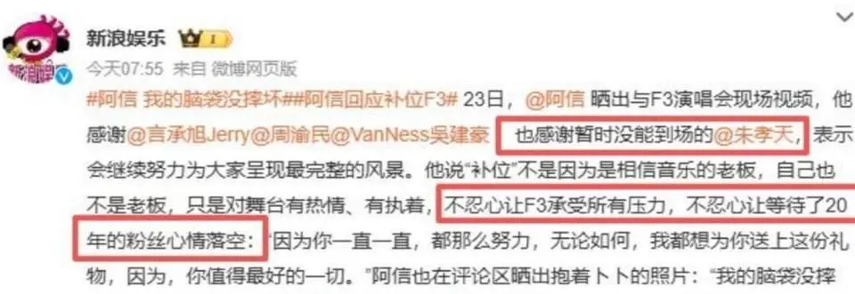 不管原因如何,结果就是F4的“F✦FOREVER 恒星之城”巡回演唱会,从2025年12月19日的上海站开始,阵容就变成了言承旭、周渝民、吴建豪,以及作为“特邀嘉宾”加入的五月天主唱阿信。阿信不仅负责串场和合唱,甚至还在演唱会中不慎摔下舞台,成了新闻焦点。2025年12月5日,为演唱会预热的新歌《恒星不忘Forever Forever》上线,作曲周杰伦,作词阿信,演唱者名单是周杰伦、阿信、言承旭、吴建豪、周渝民。从头到尾,都没有朱孝天。